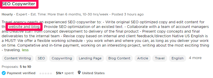 The image above shows that clients on a popular freelancing platform seek for specific roles when posting their copywriting requirements. This does not mean that you can’t always add other roles as your copywriting business grows, with time, you will find your strength in other roles.