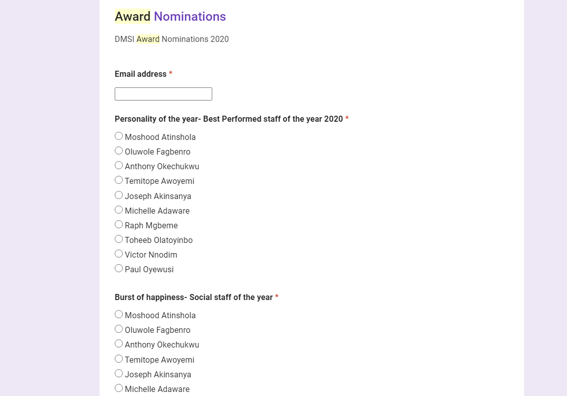 Apart from that initiative, we were also required to vote other team members in a list of categories designed by the management, believe me, this was the “Grammy” of DMSI.