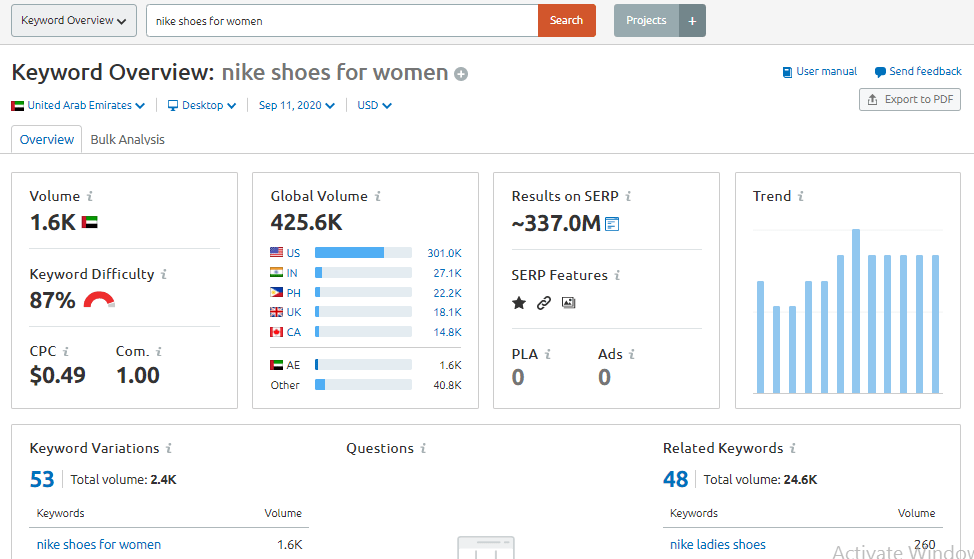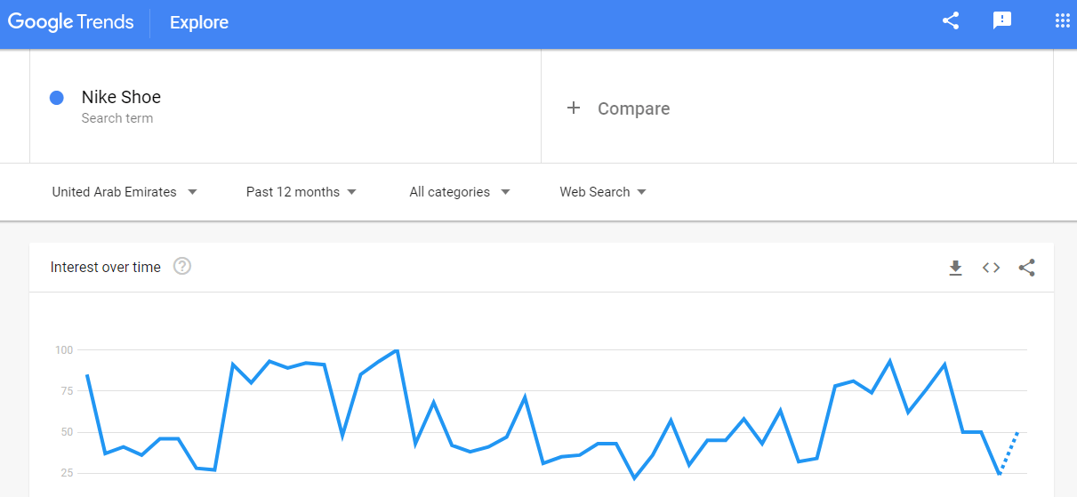 Take, for instance, you’re in a dropshipping business and one of the products you dropship is Nike shoes for women. Then, let’s take a look at the search volume for the keyword “Nike shoes for women” with a location-based search for UAE.