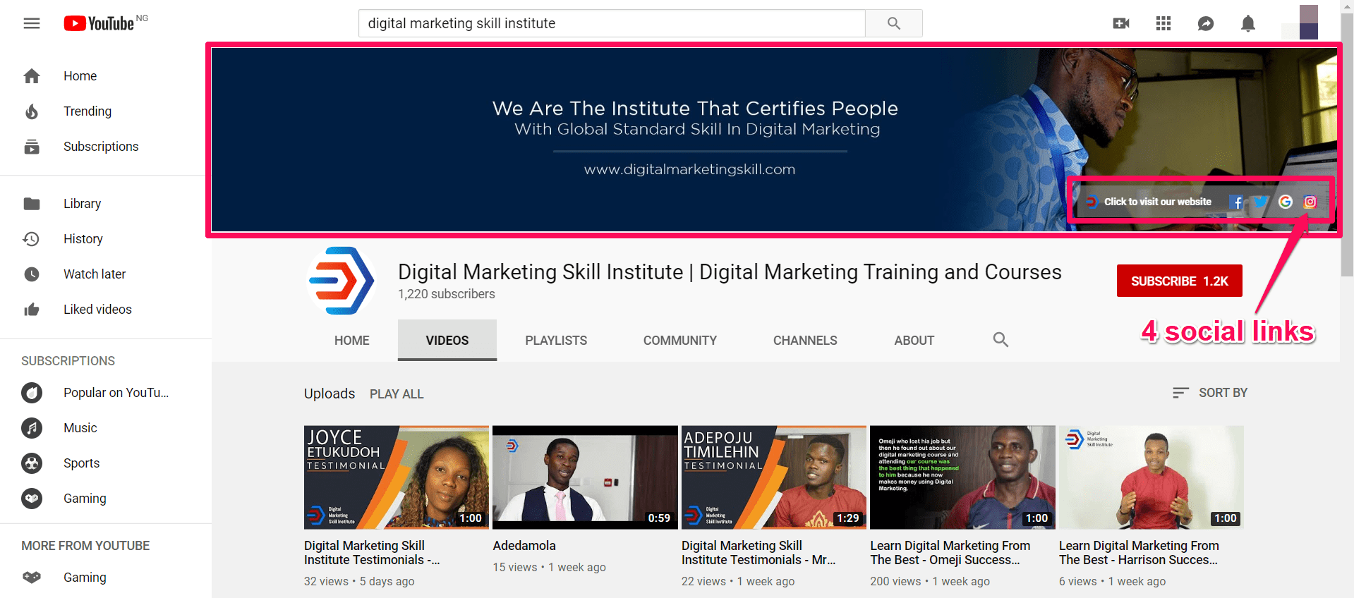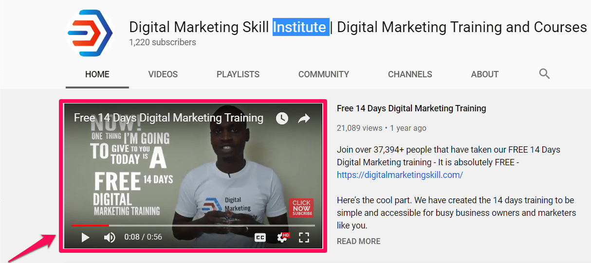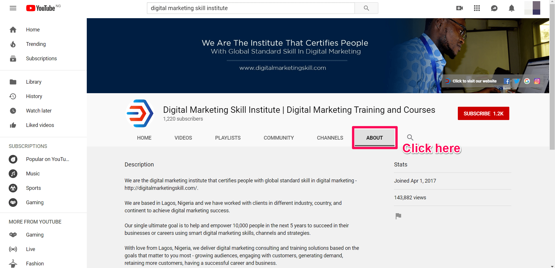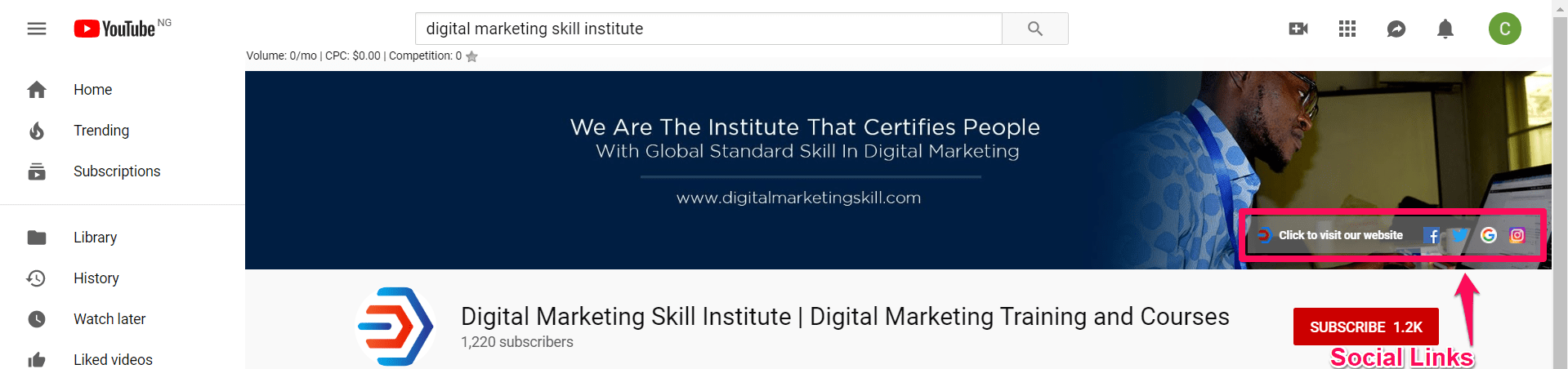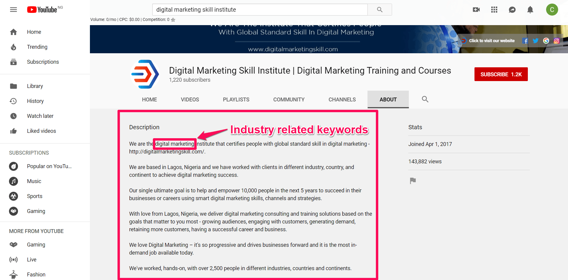 [bctt tweet=”One of the many hacks to increase visibility of your YouTube channel on search results is to craft your YouTube channel’s description with industry-related keywords” username=”dmsinstitute”]