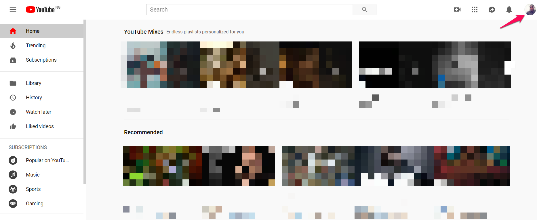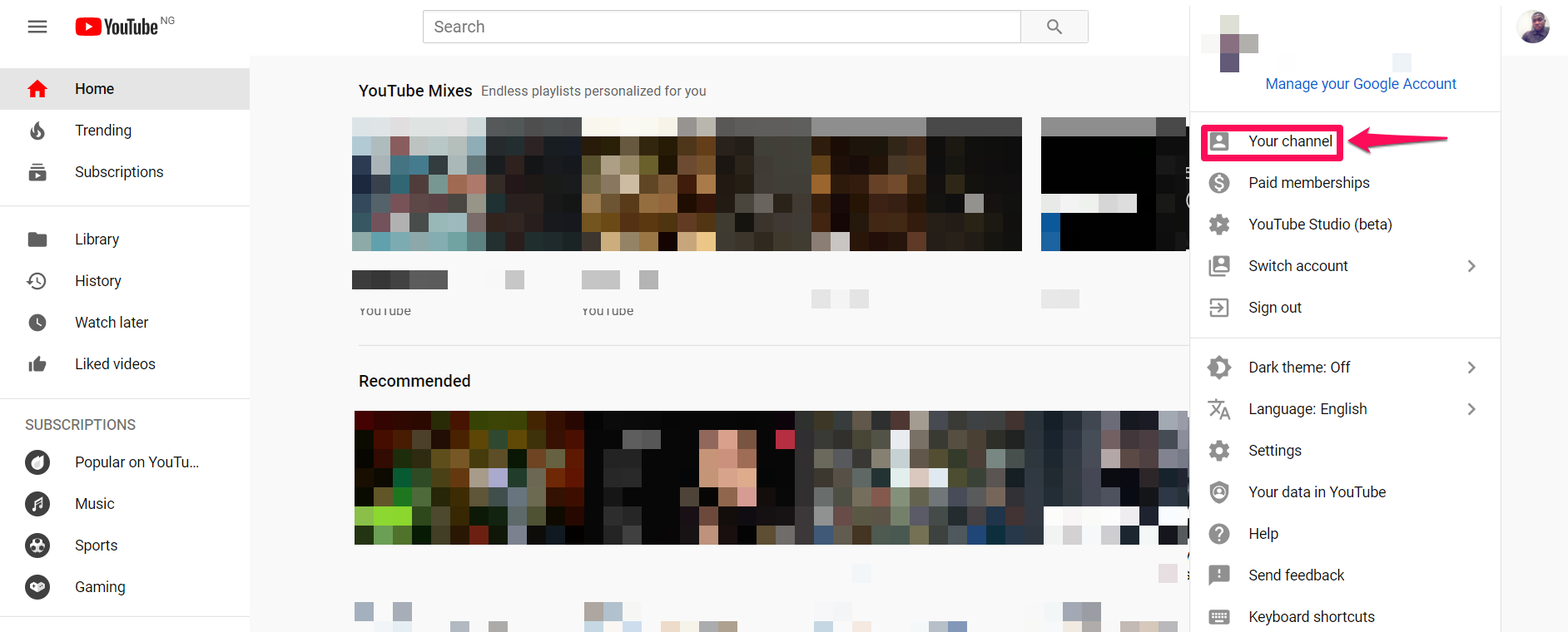 The profile avatar is located on the top right side of the page, you will find a drop-down of information with “your channel” as the top link