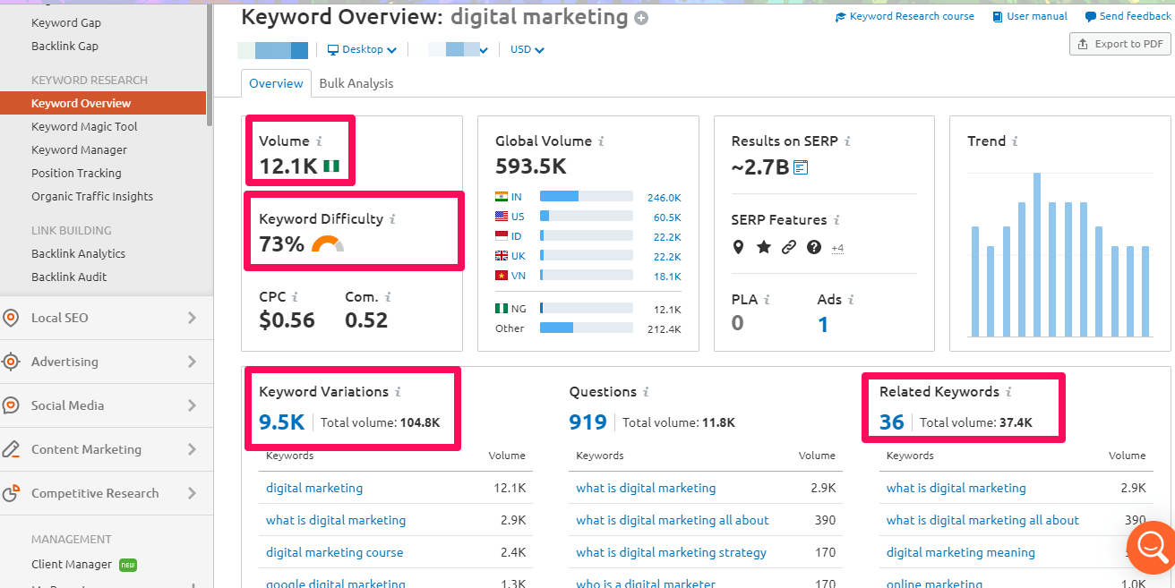 Semrush’s Keyword Tool is a good tool for achieving this. It gets you insightful data, enabling you to research the entire market in your industry by starting with a seed keyword.