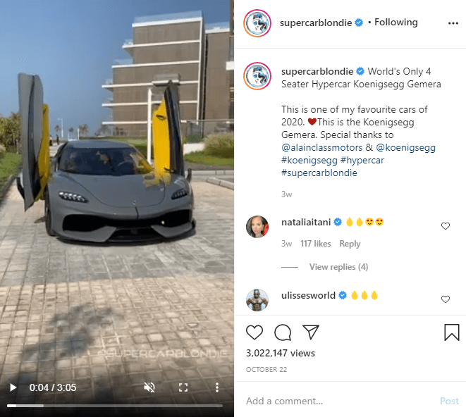 Alex, from @supercarblondie on Instagram does a very good job to grow the interest of her followers and increase her follower base by showing awesome reviews of cars, and right now, she has a follower base of more than 7 million people, an average of 2,000 comments on her posts and 2 million views.